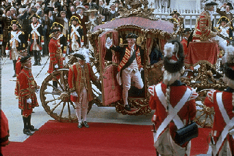 The film makes a great deal of the loss of the "colonies" (although by 1788, the date of the film's opening, they had already been lost for some time), perhaps intending to draw a parallel with the loss of the King's sanity, or perhaps simply to increase the appeal of the film for an American audience. The idea of the lost American colonies being the "place we don't mention", however does serve to highlight once again the superficiality of the royal court -- a place where appearance is more important than reality -- forbidding the mention of America makes it seem as though it was never lost. This is contributed to by the sumptuous costuming and the music of Handel (adapted by George Fenton, who is also known for the music of Dangerous Liaisons) which helps in creating the ornate public facade which initially disguises the chaos beneath the surface of the court, a chaos which becomes visible through the King's behaviour during a performance of The Water Music; George leaps up and takes charge of the harpsichord and turns Handel's elegant Minuet into a cacophony. Indeed, this idea forms one of the major themes of both film and play. The aura of majesty surrounding King George is stripped away layer by layer like the removal of his royal robes as his affliction worsens. He is reduced somehow to the level of common humanity once the arcane rituals of courtly behaviour cease to be applied to the once sacrosanct royal person, eventually being manhandled and suffering degradations akin to those of the lowest inmate of Bedlam. This thematic movement reaches a form of climax when George, in a moment of revelation declares that he can now remember how to "seem" himself. He is able once more to project an image of self that is appropriate to the world's perception of what it is to be a monarch. Throughout his madness, George recalls he had always felt himself, but is only deemed cured by the stern Dr Willis (Ian Holm) when he can remember how to "seem". George has known all along that surface appearance is what is truly important in royal life; he constantly reminds his family that the principal duty of royalty is simply to "smile and wave -- that's what you're paid for!"