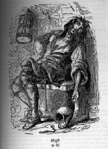 Hugh's physical decline from a figure seen as "muscular and handsome" to one who poses the threat of violence is the essence of Phiz's caricatures. Such a depiction was clearly in tune with the author's imaginative vision.
