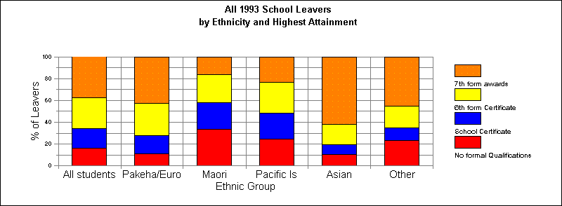 37.5% of all school leavers in 1993 gained 7th form awards. The proportion of Asian students with the form awards was 61.7%, whereas the proportion for Pakeha (a) students was 42.6%, for Maori students, 16.3%, and for Pacific Islands student, 23.5% (see the diagram in the appendix).