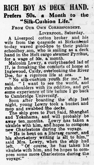 Hugh had previously visited every newspaper office within a radius of thirty miles ... and informed them precisely of his intention to sail on the Philoctetes, counting on the prominence of his family ... to make the story, and hence supply the needed publicity UTV, 161.