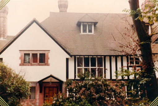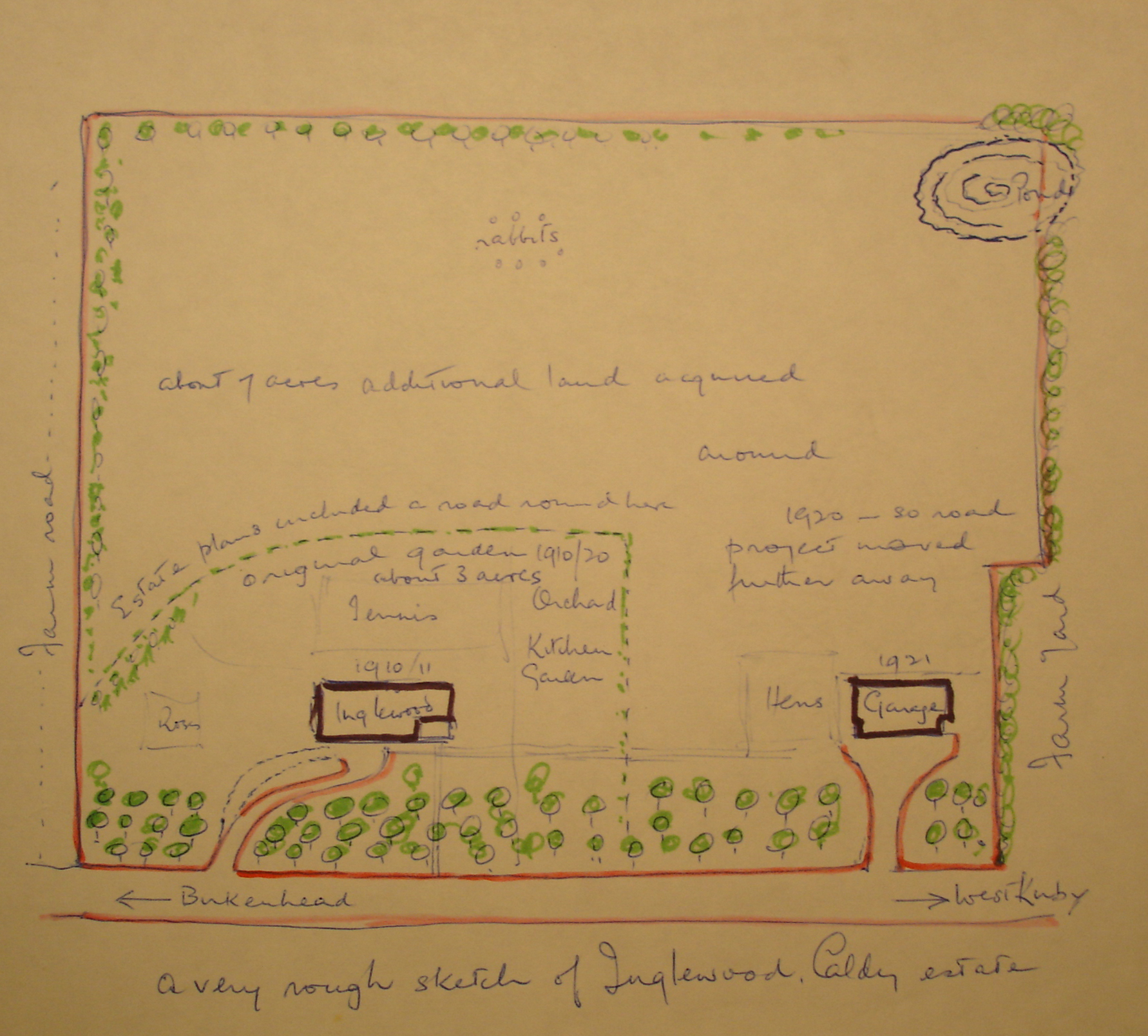 Lowry's boyhood home "Inglewood", in the small town of Caldy on the Wirral peninsula, Cheshire. Lowry's boyhood room is the upper one, partially obscured by the tree. Russell Lowry made a rough sketch of Inglewood and its estate (below, courtesy UBC Special Collections). |