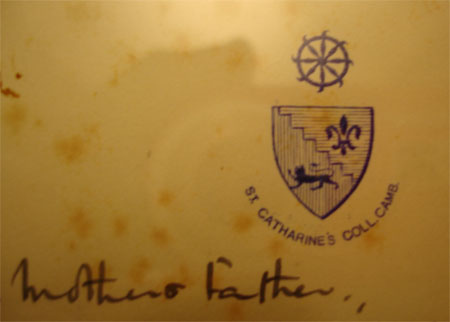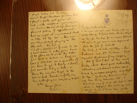 My dear Mother and Father, I was again interrupted upon Monday with my weekly letter by F. Gordon Wood, who has stayed up here for two days for an organ festival. He seems to get more + more depressed about the fate of Caldicott. The master of St Catherine's [sic] College Rev. Rushmore and Mrs Rushmore 'have requested the pleasure of my company' + that of Paul Fitte's at tea mext Sunday, which shall prove moderately interesting and shows a certain merit because by no means everybody is invited to tea. Yesterday there was a big rag here being November 5th. I didn't see any of it at all, but I read about in the papers this morning and seemes to me to have been pretty absurd. I played hockey last Thursday against Duxford Aerodrome for Cam. H. C. + played a pretty good game at back with aeroplanes zooming over our heads and always having a pleasant feeling of apprehension that one might at any moment duck a little bit too low there was an international playing on the other side! We lost I've got a frightful lot of work to-do + have chosen a rather grim time of the afternoon to write this letter as I have a lecture in half an hour + it'll take me a quarter of an hour to get to Bowes + Bowes, five minutes to buy a book, + thence ten minutes to get to the lecture hall. Thanks awfully my dear mother for your very very sweet letter. Heaps of love. Malcolm. Notes / background