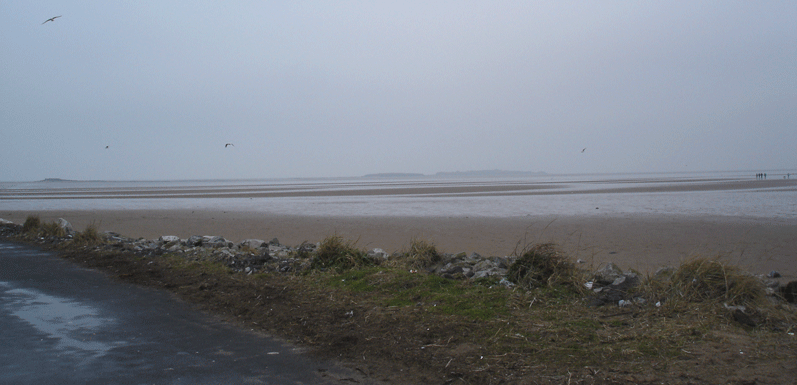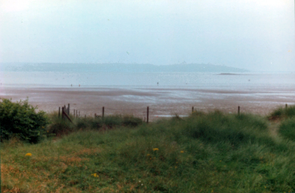 The estuary is that of the River Dee, as seen from the Royal Liverpool Links, Hoylake, looking towards the Clwydian Mountains of northern Wales. The antediluvian forest and the windmill like a black flower intimate Atlantis, Don Quixote and betrayal. The island mentioned is Hilbre, accessible only at low tide. (See below.) At Leasowe, a little further round the coast to the north, there is a tower that perhaps looks like a windmill and offshore, a sunken petrified forest (no longer visible). Above: the estuary of the River Dee, seen from the Royal Liverpool Links. Below: The Dee estuary, as seen from West Kirby, a mile or two north of Hoylake. |