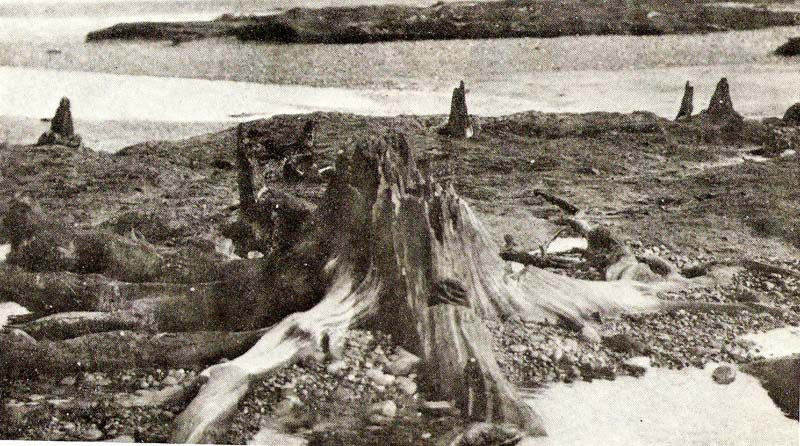 Above: The petrified forest. Image courtesy Colin Dilnot. Below: The petrified forest, partially submerged, in 1982. The forest is now entirely submerged. Image courtesy wirralhistory.co.uk / wikiwirral.co.uk. ![]() |