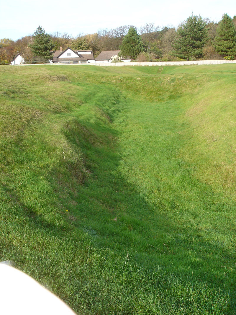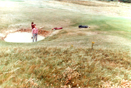 The bunker still exists on the short par-5 eighth of the Royal Liverpool Links, Hoylake (below), near the Furniss family's house, but time has filled or Lowry's imagination deepened the actual hole, the name of which derives from a notorious hazard at St. Andrews golf course. |