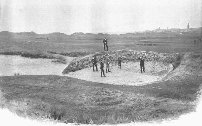 Above: The "Hell Bunker" at St. Andrews Old Course. The biggest bunker of the course, it comes into play on the second shot of the par-5 14th hole. Image: Horace Hutchinson, British Golf Links. London: J.S. Virtue & Co (1897). |