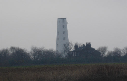 In the early 1900s, Leasowe was a tiny village and railway station on the Wirral peninsula, North Cheshire, between Hoylake and Birkenhead. Lowry has retained the name but shifted its location closer to Hoylake, which has a golf course (the Royal Liverpool Links) and is situated on the very wide estuary of the River Dee. The Taskerson home is modelled on that of the Furniss family, near the Lowry family home Inglewood, Caldy (a few miles south of Hoylake), where Lowry's wealthy father had built a small golf course on the family estate. Below: Leasowe lighthouse. |