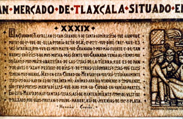 | Tlaxcala was an area close to Tenochtitlán that was never subjugated by the Aztecs, but Cortés conquered it and with the help of the Tlaxcalans destroyed the Aztec civilisation. For this reason, Tlaxcala and Tlaxcalans (such as Cervantes, the barman in the Salón Ofelia in chapter ten) are regarded as emblems of betrayal. | ||||||||||||||