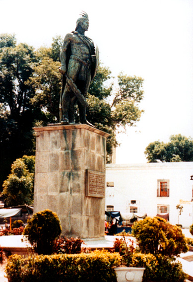 The "Xicotancatl Garden" appears to have been based on the small plaza just off the Zócalo in Tlaxcala, the dominant feature of which is the statue of the younger Xicotancatl, hero of Tlaxcala, who led the Tlaxcalans against Cortés and who, even when peace had been made, never really accepted the alliance with the Spaniards, regarding them (with some justification) as more dangerous than the Aztecs. |