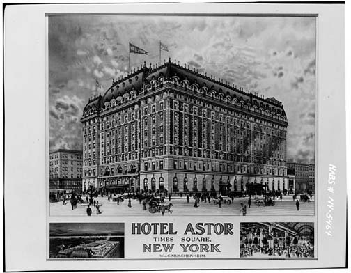 The 11-floor Astor Hotel was built in the Bueax-Arts style by architects Clinton & Russell at 1515 Broadway at West 44th Street, NW Corner to West 45th Street.
