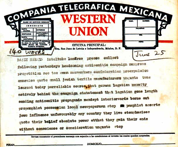 | … his final dispatch (sent that morning from the Oficina Principal of the Compañia Telegráfica Mexicana, Esq., San Juan de Letrán e Independencia, México, D. F.) UTV, 94.