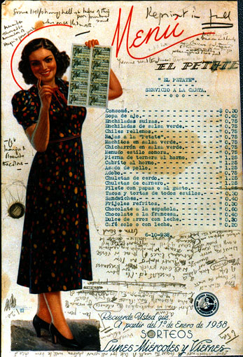 | The whole left side of the menu was taken up by a full-length lithographic portrait of a smiling young woman … she was buxom and dowdy, with a quasi-American coiffure, and she was wearing a long, confetti-colored print dress: with one hand she was beckoning roguishly, while with the other she held up a block of ten lottery tickets, on each of which a cowgirl was riding a bucking horse UTV, 329.