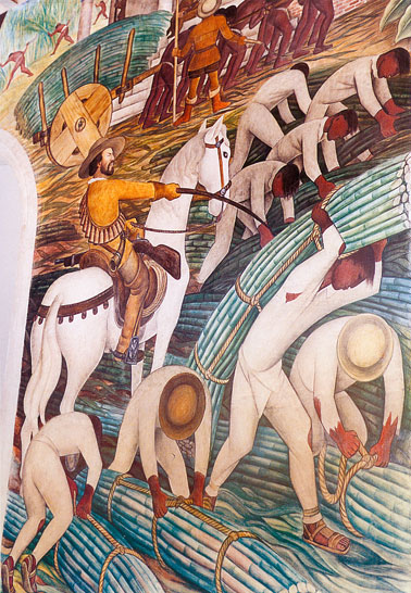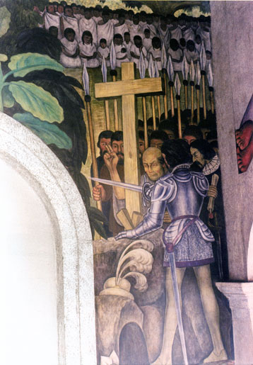 This part of the mural represents the imposition of the Christian faith upon the Indians.