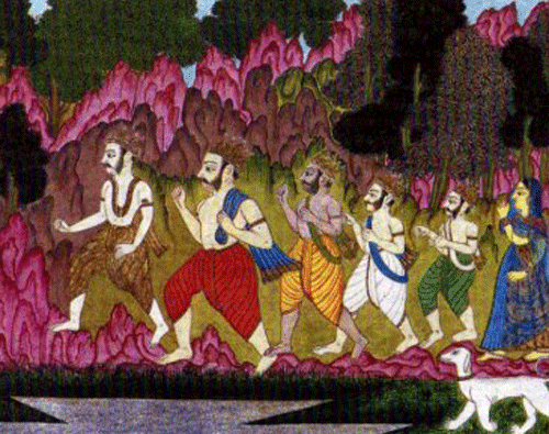 The episode features in the Consul's horripilating vision at the beginning of the fifth chapter. Left: Draupadi, wife of all five Pandava brothers, follows them to Meru, the abode of Hindu gods, when they renounce the world; they are led by Yudhisthira and accompanied by his favourite dog; from the Persian version of the Mahabharata. |