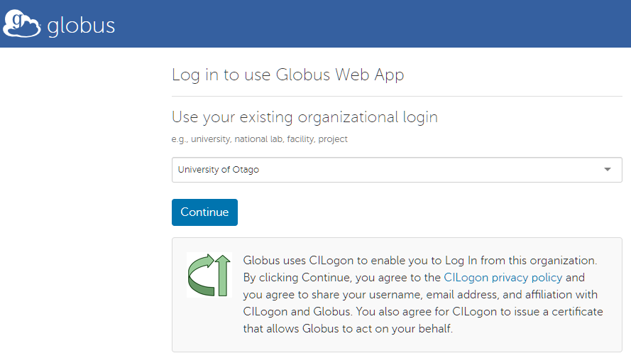 Go to app.globus.org and search for University of Otago in the Use your existing organizational login section of the page.