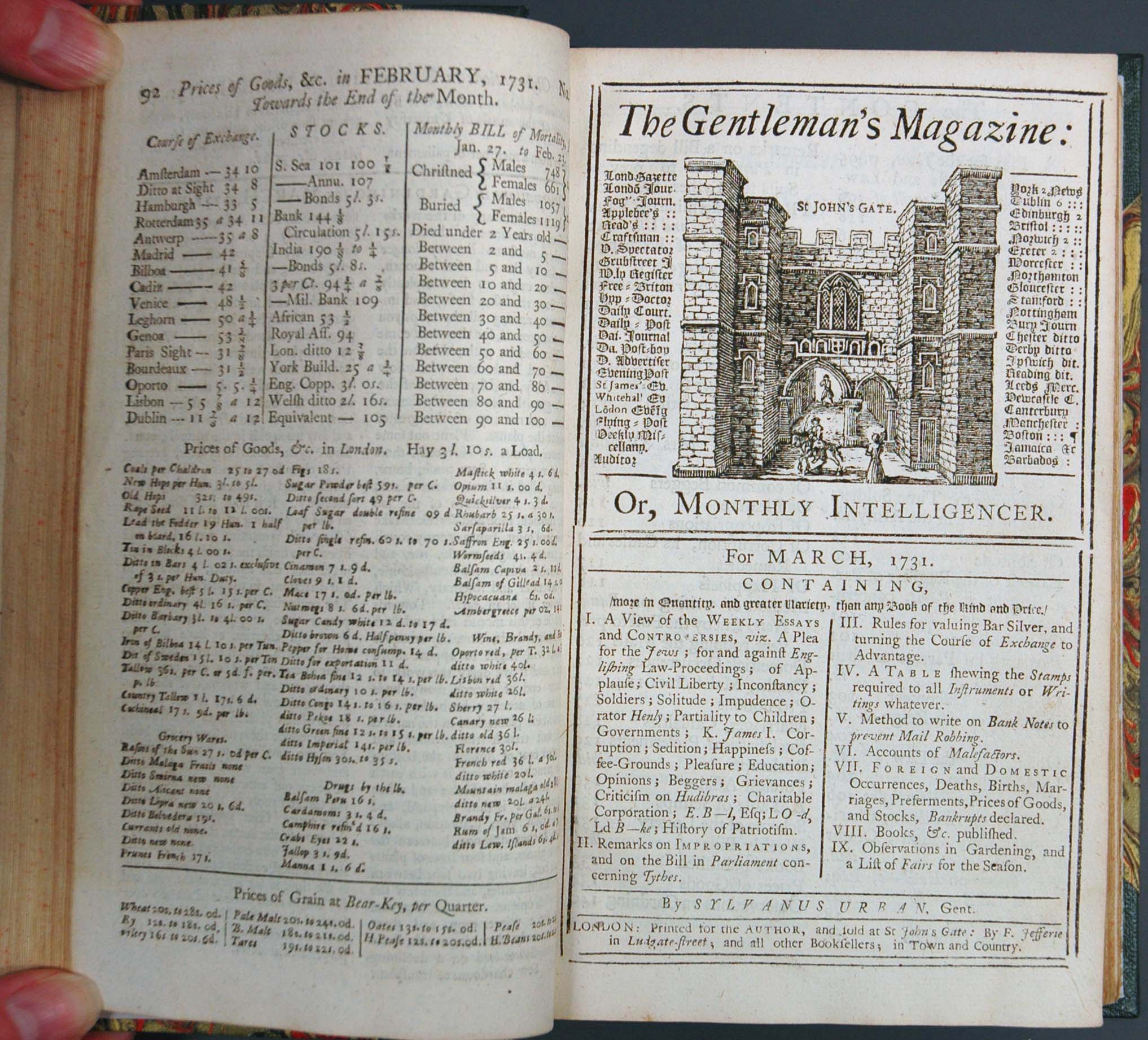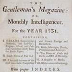 The Gentleman's Magazine was begun by Edward Cave (1691-1754), printer and magazine proprietor, in January 1731. This compendium began as a digest of London newspapers and periodicals for country customers (thus his editorial pseudonym, Sylvanus Urban) and ended up a very successful publication, aimed at interesting the educated eighteenth-century reader. Cave, who coined the word 'magazine', attracted original verse contributions from Richard Savage, Dr Johnson, Elizabeth Carter, and Mark Akenside, and even took to popularizing science in its pages. He also published works such as Dr Johnson's Rambler (1750-52), and John Hawkesworth's Adventurer (1752-54). Special Collections is fortunate to have a complete run of The Gentleman's Magazine from January 1731 through to 1866. |