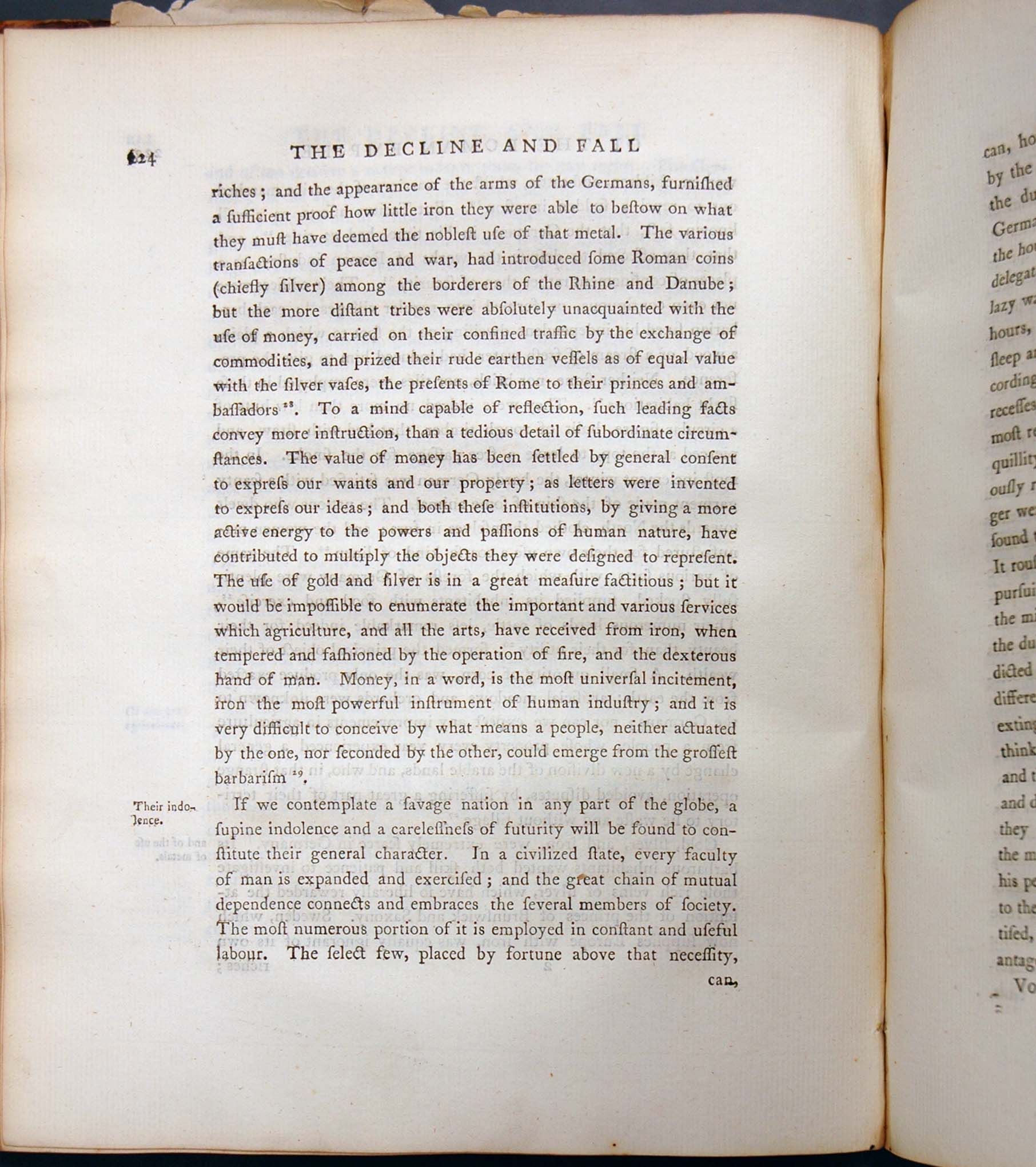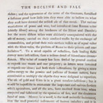 Edward Gibbon's Decline and Fall grew out of the now famous apocryphal musing: 'It was at Rome... as I sat musing amidst the ruins of the Capitol, while barefoot friars were singing vespers in the Temple of Jupiter, that the idea of writing the decline and fall of the city first started to my mind.' This monumental literary work, akin to T.E. Lawrence's Seven Pillars of Wisdom, was finished at Lausanne, Switzerland, on 27 June 1787: 'I wrote the last lines of the last page in a summer-house in my garden.' William Strahan, Gibbon's publisher, was right: 'I will venture to say, it will ere long make a distinguished figure among the many valuable works that do honour to the present age; will be translated into most of the modern languages, and will remain a lasting monument of the genius and ability of the writer.' This is the first volume of the first edition. |
