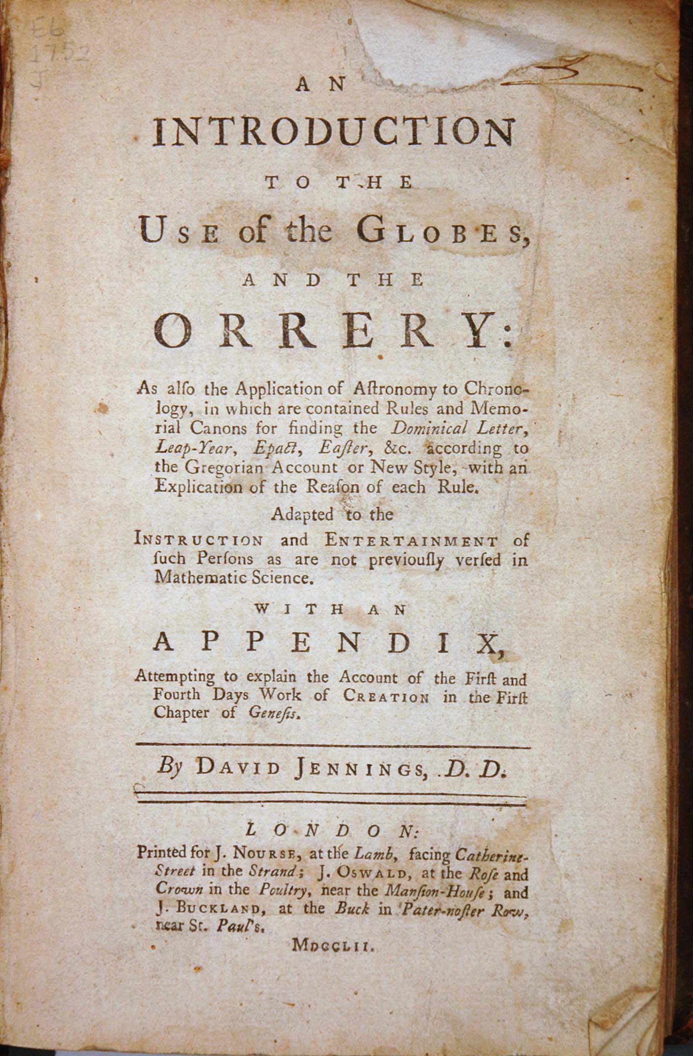 David Jennings, An Introduction to the Use of the Globes and the Orrery. London: Printed for J. Nourse…J. Oswald, …and J. Buckland, 1752. DeB Eb 1752 J