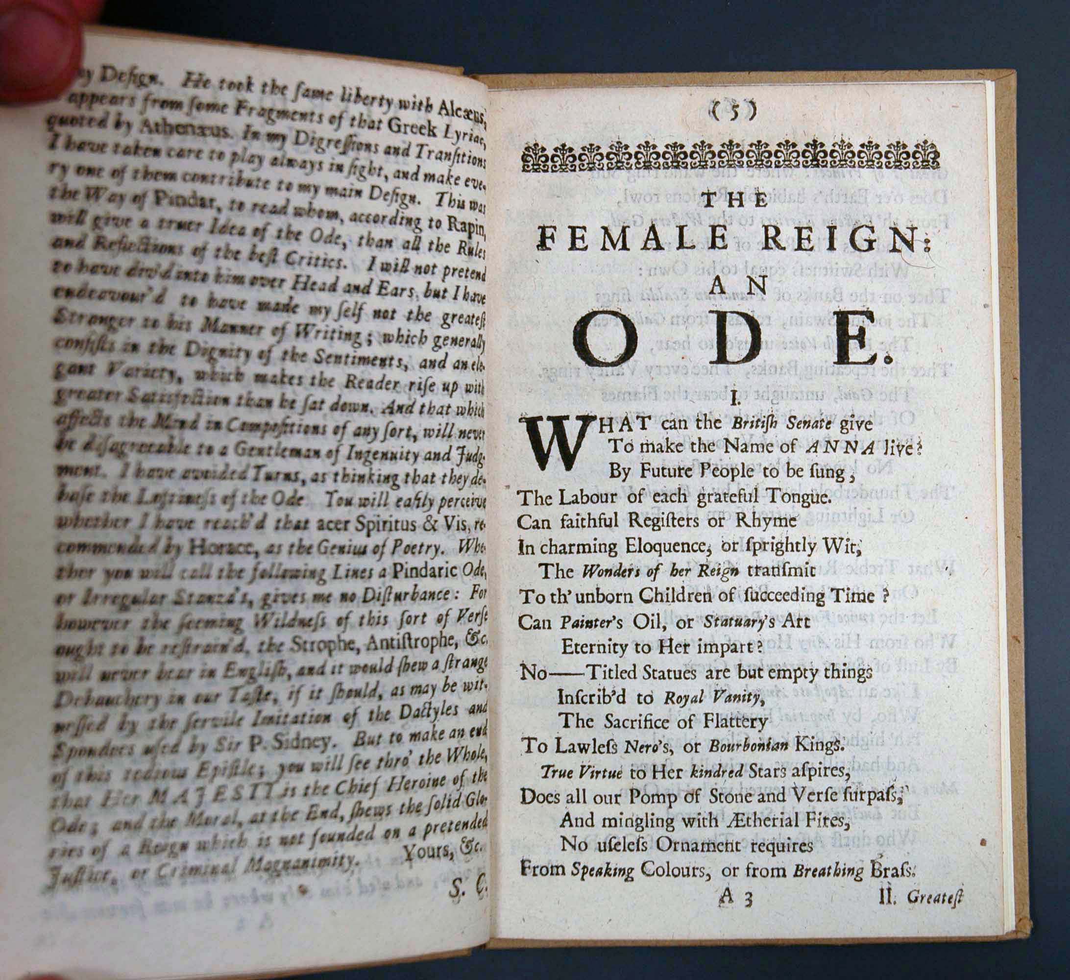 During 1688 to 1815, the period known as the long eighteenth century, the British people were at war almost continuously. There was the Nine Years' War (1689-97), the War of the Spanish Succession (1702-13), the War of the Quadruple Alliance (1718-20), the War of Jenkins's Ear (1739-48), the War of the Austrian Succession (1740-8), the Seven Years' War (1756-63), the War of Independence (1775-83), the war with Revolutionary France (1793-1802), and the Napoleonic Wars (1803-1815). Successful battles such as Blenheim (1704) under the leadership of the Duke of Marlborough reflected well on the reign of Anne, Queen of England, Ireland and Scotland from 1702 to 1714. Laudatory war poems often puffed up morale. In his much-printed jingoistic poem The Female Reign, Samuel Cobb (1675-1713) called her 'O Anna, British heroine!' She was married to Prince George of Denmark. |