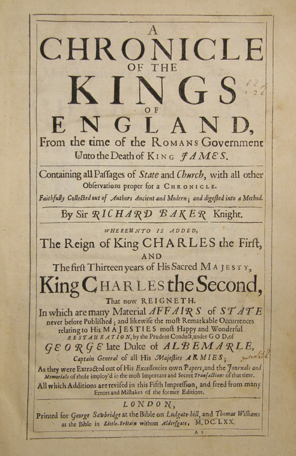 Richard Baker, A Chronicle of the Kings of England, from the Time of the Roman Government unto the Death of King James (London: George Sawbridge and Thomas Williams, 1670) de Beer Ec 1670 B
