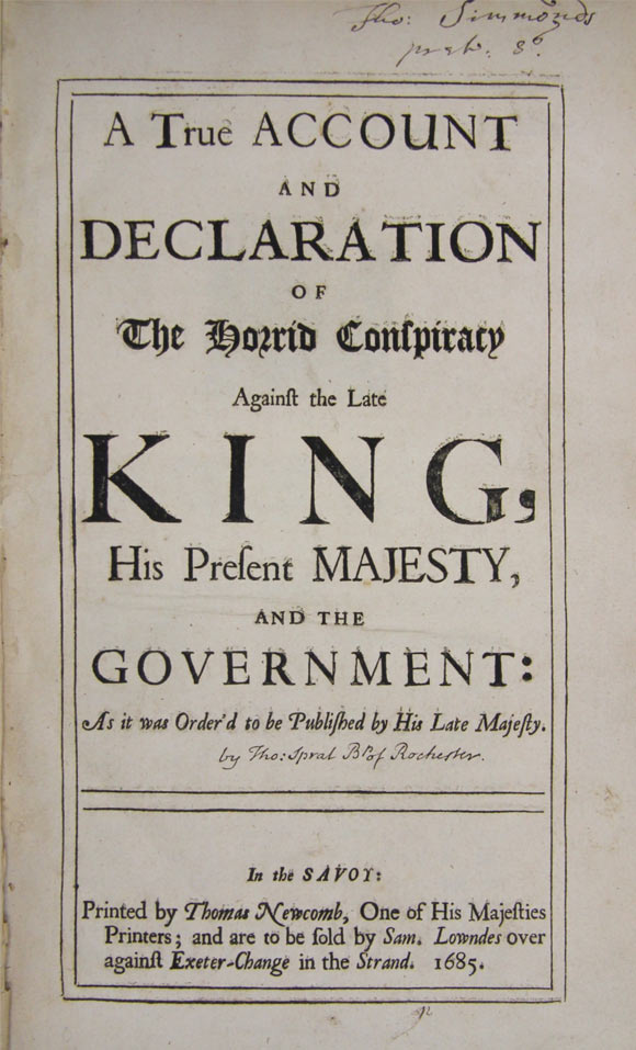 Thomas Sprat, A True Account and Declaration of the Horrid Conspiracy against the Late King, His Present Majesty, and the Government: as it was Order'd to be Published by His Late Majesty (London: Thomas Newcomb, 1685) de Beer Ec 1685 S