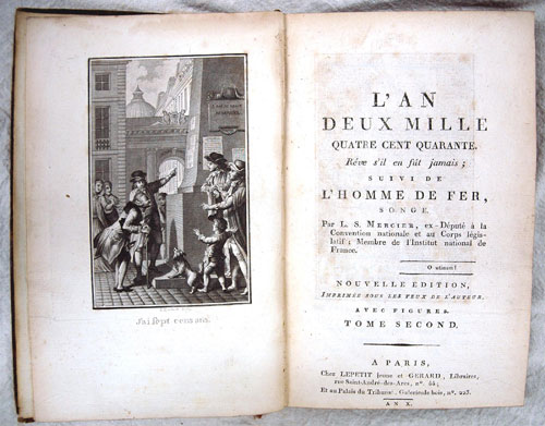 Mercier's "L'an 2440" was originally published in 1771 (it went through twenty-five editions after its first appearance), and is one of the better known Utopian novels. After a 'Rip Van Winkle' sleep of 700 years, the unnamed adventurer awakes to find France is an enlightened country, but still a monarchy. It is a premise ripe for satire. Indeed, Mercier's futuristic Paris has a new justice system, efficient hospitals, and there are no monks, priests, prostitutes, standing armies, slavery, taxes, tea or tobacco. Potentially seditious, the Church authorities put the book on the "Index" in 1773, and in 1778, it was judged heretical in Spain, banned and reputedly burned by the King himself.