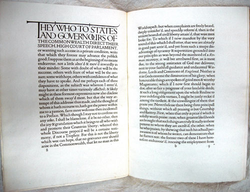 John Milton's "Areopagitica", his attack on licensing, had no real effect on governmental policy or on his contemporaries when it first appeared (without benefit of authorization or registration) on 23 November 1644. There was a minor ruffle. In 1658, Oliver Cromwell condemned it as did the 'Little Parliament'. These days Milton's treatise stands as a seminal work against censorship and for personal liberties. All readers are familiar with the often quoted: 'Who kills a man kills a reasonable creature, God's image; but he who destroys a good book, kills reason itself, kills the image of God, as it were in the eye.' This is a Doves Press edition of 1907.