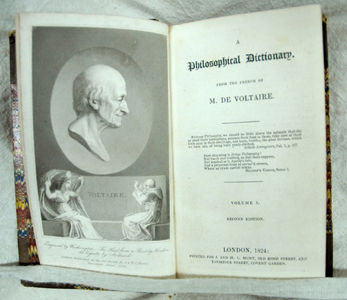 Voltaire, the chief standard-bearer of the Enlightenment, wrote in his :Philosophical Dictionary": theological religion is 'the source of all imaginable follies and discords; it is the mother of fanaticism and civil discord; it is the enemy of mankind.' It was in this work, Voltaire's major anti-Christian attack, that the phrase 'Dare to Think for Yourself' first occurred. First published in 1764, it was almost immediately condemned and burned in France, Geneva, the Netherlands, and Rome. One critic called it 'a contagious poison'. Thirty-seven other works by Voltaire, including his "Letters Concerning the English Nation" (1733) were also banned.