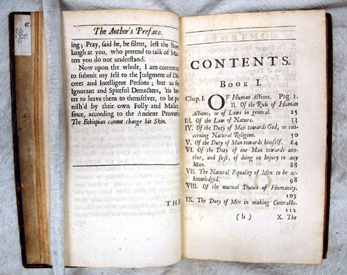 The Italian philosopher Vico (or Vigo) described Samuel von Pufendorf (1632-1694) as one of the 'three princes' (alongside Grotius and Selden) of the natural law of nations. Through his classic "On the Law of Nature and Nations" (1672), Pufendorf posited that every individual has a right to equality and freedom on the basis of human dignity. His writings also evoked a separation of the natural world of human affairs from the spiritual realm of theology. A year later, Pufendorf complied his popular "The Whole Duty of Man According to the Law of Nature" (1673), excerpted from the above title. In 1714, "Law of Nature" was classified as an irreligious work and added to the "Index", while in 1747, it was proscribed by the Spanish Inquisition.