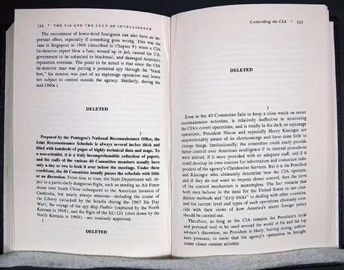 In their 1974 book, Marchetti and Marks set the scene from the very first sentence: 'There exists in our nation today a powerful and dangerous secret cult – the cult of intelligence.' The right to publish the material was challenged by CIA officials in April 1972 and which continued to mid-1975. Marchetti's right to free speech was balanced against so-called classified and 'dangerous' information. The original number of deletions (DELETED) required by the CIA were 339 passages; all but 168 were reinstated (boldface type). Clear evidence of censorship is on display.