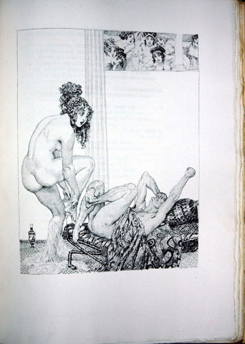 While earlier editions of "Satyricon" did not face banning or prosecution, it was Jack Lindsay's modern translation, published in a limited edition print run by Fanfrolico Press, that caused trouble. In 1934, the book was ordered to be destroyed by the police court of the City of Westminster. Norman Lindsay's illustration of "Pannychidis" (Panichidis – signifying 'night') evokes a more mature girl than that of the seven year-old in the text. Perhaps Lindsay's artistic license was driven by Quartilla's notion in the satire that Pannychidis was not too young to wed and endure all the 'opportunities' of marriage. This is copy no. 112 of only 650 printed.