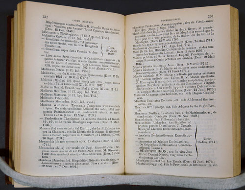 The "Index Librorum Prohibitorum" ('List of Prohibited Books') was established by the Congregation of the Inquisition of the Roman Catholic Church in 1559. The aim of the list was to prevent the reading of immoral books or works containing theological errors and so prevent the corruption of the faithful. The Index also contained some scientific titles. The 32nd edition, published in 1948, contained 4,000 titles censored for various reasons: heresy, moral deficiency, sexual explicitness, political incorrectness, and so on. Notable writers in the list include Montaigne (as detailed here), Rabelais, Defoe, Balzac, and Jean Paul Sartre. 'The loss of relevance of the Index in the 21st century' saw it abolished on 14 June 1966, by Pope Paul VI. This 1855 edition is from the Shoults Collection.