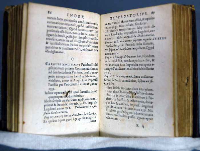 The Catholic Church's Index was not simply a reactive work; authors were encouraged to defend their works and they could re-publish with elisions if they wished to avoid a ban. Manuscripts that passed inspection by official readers were printed with nihil obstat ('nothing forbids') or Imprimatur ('let it be printed') on the title page. To aid readers, an expurgated index was produced that contained a list of books from which passages marked as dangerous to faith or morals were to be removed before the books were read. Here Charles de Moulin's classic work on customary laws of France and Paris (1539) is under scrutiny.