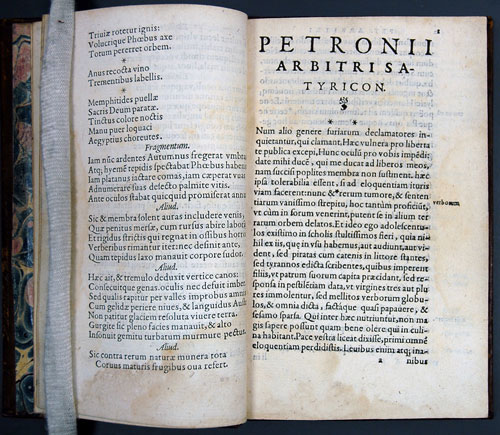 'Such a long time has passed since first I promised you the story of my adventures...'. So begins Petronius' "Satyricon", a fragmentary mix of Latin prose and poetry portraying the seedier side of Roman life. Petronius was the 'Arbiter of Taste' under the emperor Nero. Tacitus, in his Annals, offers a description of Petronius: 'He spent his days in sleep, his nights in attending to his official duties or in amusement, that by his dissolute life he had become as famous as other men by a life of energy, and that he was regarded as no ordinary profligate, but as an accomplished voluptuary.' While the 'novel' was never officially banned, it was Federico Fellini's lush cinematic interpretation in 1968 that caused much controversy. This 1575 French printing of Satyricon is from the Shoults Collection.