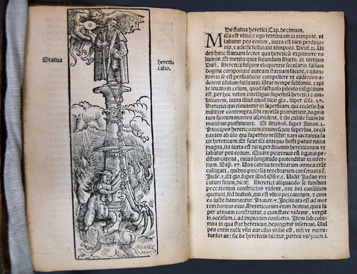 The Church was the single most powerful institution in 16th Century Europe. With the invention of the printing press, faster communications, an increased literacy rate, and a loosening of the monopoly on the dissemination of knowledge, it was increasingly under attack. 'Keeping the Faith' was paramount; censorship was in the air. Bernard of Luxemburg, a Dominican theologian, was one who rigorously maintained the status quo. As an Inquisitor in the dioceses of Cologne, Mainz (the birthplace of printing) and Trier, he produced the perfect 'fear-mongering' book. His catalogue of heretics was immensely popular.