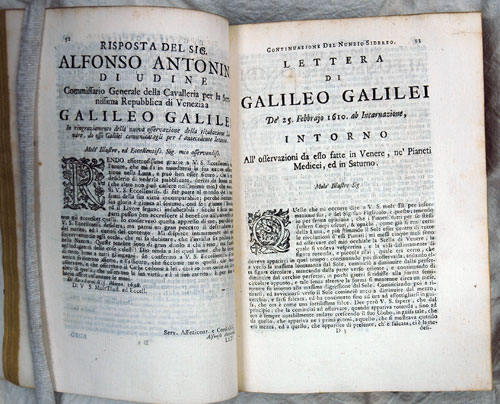 In 1616, the heliocentric system of Copernicus was denounced as dangerous to the Catholic faith. Six years earlier, in March 1610, Galileo published his 24 page pamphlet "Siderus Nuncius" (The Starry Messenger; March 1610) which described his astronomical observations of the moon and the planets. While not proving Copernicus was correct, Galileo certainly cast doubt on the Aristotelian geocentric model prevalent at the time. In 1632, he furthered the case for Copernicus's heliocentric theory by publishing "Dialogue Concerning the Two Chief World Systems, Ptolemaic and Copernican". The book was condemned by the Church and Galileo was charged with heresy and placed under house arrest for the rest of his life. Galileo's name remained on the Catholic Index until 1835, when his name was removed. However, he was not officially rehabilitated by the Church until 1992. This is a later edition of his Works, printed in 1718.