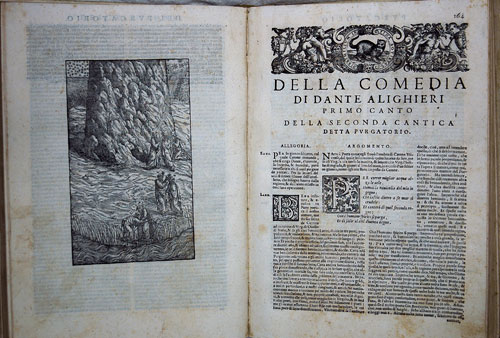Dante's classic Divina Commedia was first printed in Foligno in 1472. Although Dante places corrupt popes in the eighth circle of Hell and railed invectives against Pope Boniface VIII, his Divine Comedy was not prohibited in Italy. It was however deemed offensive in Portugal and Spain. In 1581, the Portuguese authorities called in all copies for expurgation while the Spanish Index of 1612 eliminated three passages from the poem. Earlier, in 1497, Savonarola burned it, together with De Monarchia (Dante's treatise on papal versus secular authority, which was publically burned) in the 'bonfire of the vanities'. This edition contains commentaries by Alessandro Vellutello and Cristoforo Landino, with illustrations possibly executed by the engraver Giovanni Britto.