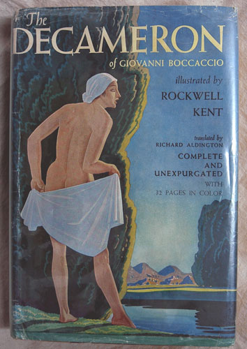 While in seclusion and escaping from an outbreak of the plague, a group of young men and women divert themselves by telling stories to each other. These tales form Boccaccio's Decameron, which was probably written about 1350. Although eight of the 100 tales are erotic, it was placed on the Roman Index of Forbidden Books in 1559 by order of Pope Paul IV, with objections centred around 'offensive sexual acts' in which clerics, monks, nuns and abbesses in the work engaged. However, its popularity was so great that an expurgated version was printed in 1573. Over time, it has offended numerous other agencies, including the parliament of France, the magistrates of England, the United States Post Office, the American Library Association, and the New York Society for the Suppression of Vice. This modern edition is illustrated by the American artist Rockwell Kent.