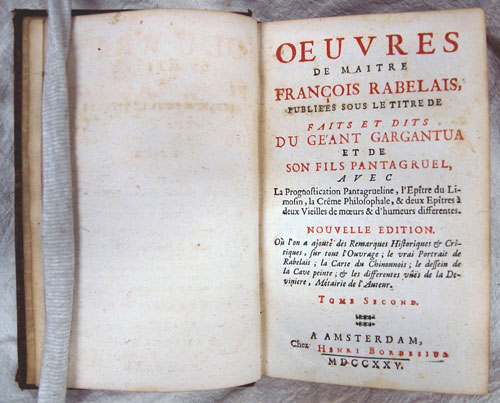When the first two books of Rabelais' Gargantua and Pantagruel were published in 1533, under the pseudonym of Alcofribas Nasier, they were promptly suppressed as obscene and sacrilegious by censors in the French Parliament. Not even support from his patron Cardinal Jean du Bellay or King François I prevented the entire five books from being placed on the Church Index. Rabelais' bawdy, scatological satire on mankind with its catch-cry 'Do As Thou Wilt' was translated into English by Sir Thomas Urquhart and Peter Motteux. With terms such as 'codpiece', 'bunghole', 'ballocks' and 'teats' used, it continued to be challenged by authorities. This 1725 French language edition was printed in Amsterdam.