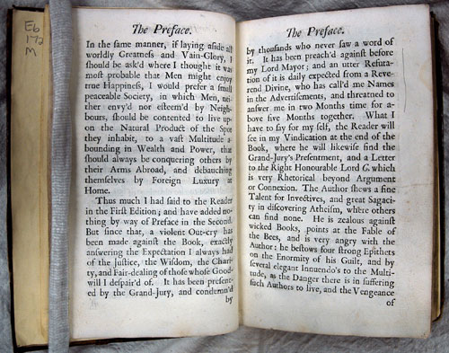 'It has been presented by the Grand-Jury, and condemn'd by thousands who never saw a word of it.' So wrote Bernard Mandeville in the preface to this 3rd edition of his satire "The Fable of the Bees" (1724). Underlying the text is Mandeville's message that vice (pride, self-interest, greed), rather than virtue, was the foundation of the emerging capitalist society. With phrases such as 'The moment Evil ceases, the Society must be spoiled', it is no wonder that Mandeville was termed the 'Anti-Christ', and the book was classified 'atheistical' with 'many blasphemous passages'. In France it was burned by the common hangman, and this 'wickedest cleverest book in the English language' (according to one critic) remained on the Church "Index" until the last edition of 1966.