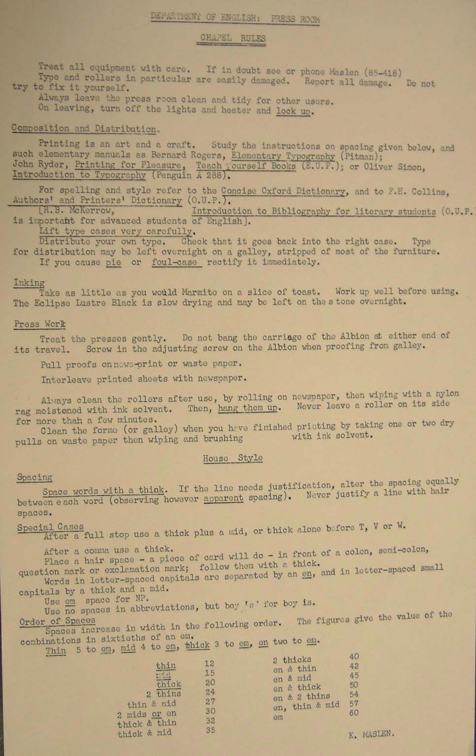 When Maslen returned to Otago from sabbatical in 1967, he was determined to put the operation of the Press on sounder ground. He drew up the ‘Chapel Rules’, which were given to each user for signing. He started a register that logged in users and visitors to the press, and in order to document the activities of the press, instigated the policy of taking two copies of every item printed. This was the beginning of the Bibliography Room Archive, now a collection filling ten boxes. No matter how skilled one was in the ‘Black Art’, there remains one golden rule: ‘type comes in fonts and lives in cases. It needs your help to go home.’ Two versions of the ‘Chapel Rules’ are on display alongside a photograph of authors Maurice Shadbolt and Elspeth Sandys (the 1996 Burns Fellow), seen admiring some of outputs from the Press. ‘Chapel Rules’, Department of English: Press Room, c. 1967. Typescript |