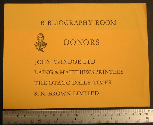 The Bibliography Room has been fortunate in its donors. The Albion hand press was begged from the Otago Museum. The Columbian hand press came from Laing and Matthews, and was probably brought to Dunedin in the mid-1860s by Henry Wise. John McIndoe gave samples of Bodoni and Plantin type, the Otago Daily Times gave founts of Garamond, and S. N. Brown supplied the type cases, now collectable as knick-knack holders. Others gave their time and expertise: Bryan Kershaw, Don Tobin, and members of the Otago Graphics Arts Club. This small poster was printed in 1967 in recognition of the generosity of these four Dunedin firms. Bibliography Room Donors, 1967 |