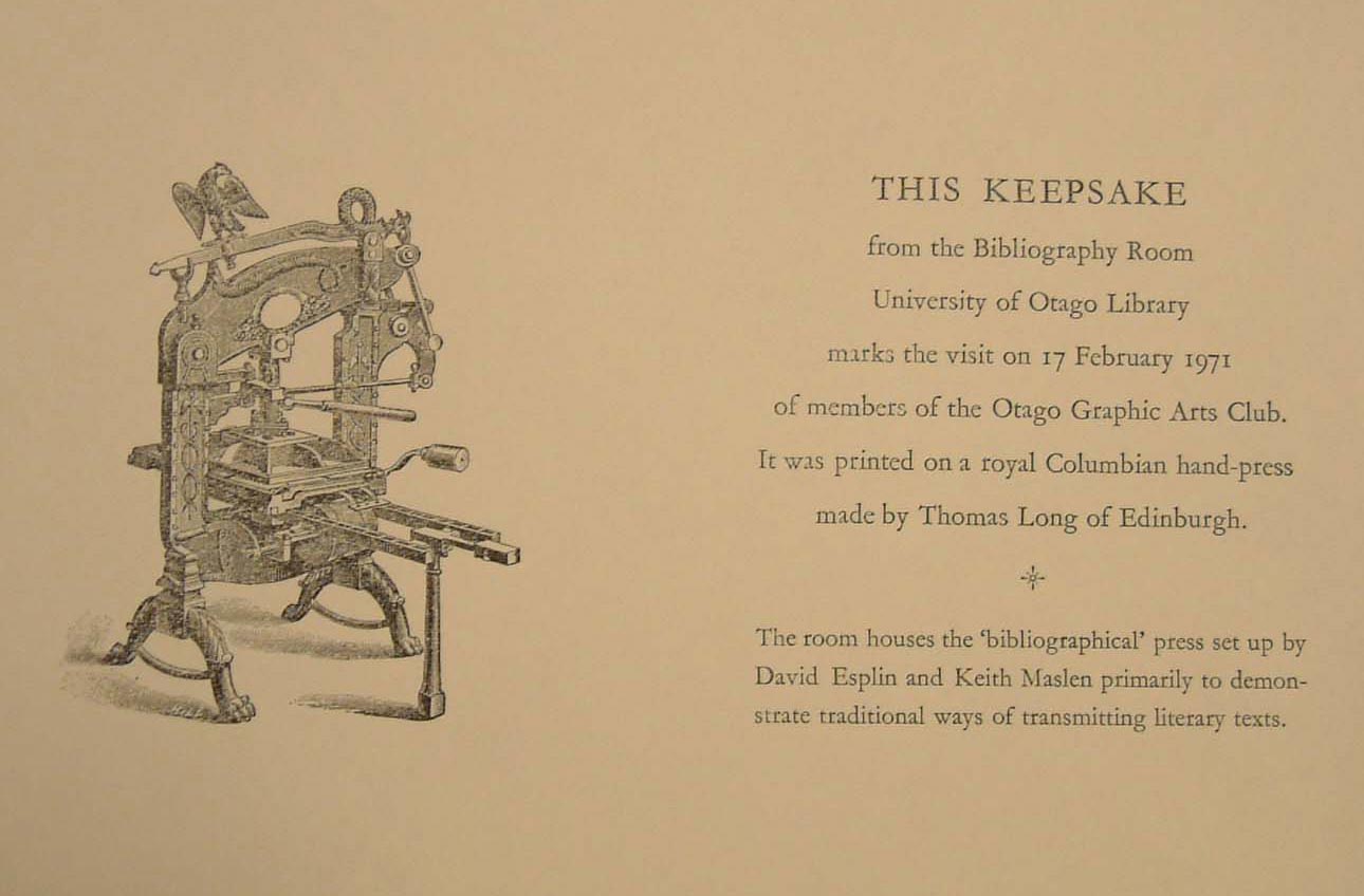 As revealed in the Register in cabinet three, there have always been visitors to the Bibliography Room. One such group was the Otago Graphic Arts Club, of which Dr Maslen was a founding committee member. Flourishing from 1970 to 1987, this group had as its first object ‘to promote and encourage a better understanding amongst persons engaged in any way or capacity in the Printing Industry, or any allied trade or profession’ (Constitution, 1974). This Keepsake was printed to mark the visit of the Club in 1971. Other visitors included Ruth Dallas and the artist Els Noordhof, seen here with Maslen examining proofs of Dallas’s Ragamuffin Scarecrow, printed in the Bibliography Room in 1969. Keepsake marking the visit of the Otago Graphics Arts Club, 17 February 1971 |