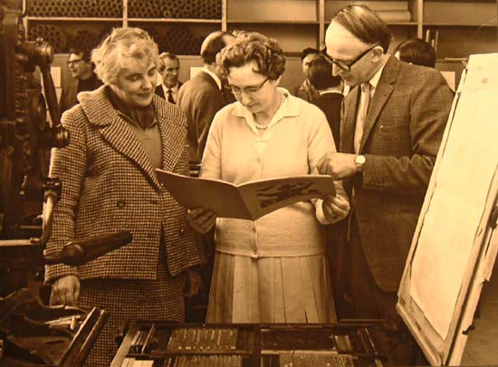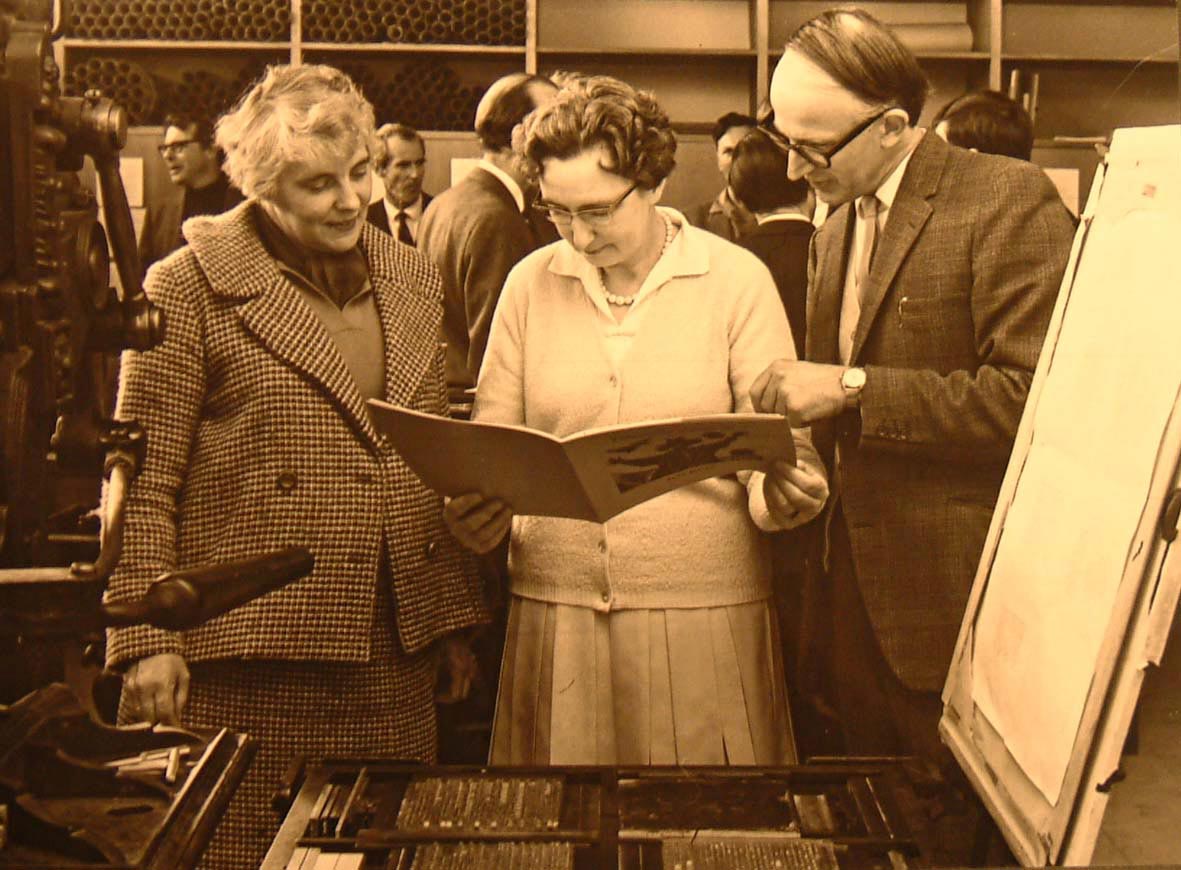 As revealed in the Register in cabinet three, there have always been visitors to the Bibliography Room. One such group was the Otago Graphic Arts Club, of which Dr Maslen was a founding committee member. Flourishing from 1970 to 1987, this group had as its first object ‘to promote and encourage a better understanding amongst persons engaged in any way or capacity in the Printing Industry, or any allied trade or profession’ (Constitution, 1974). This Keepsake was printed to mark the visit of the Club in 1971. Other visitors included Ruth Dallas and the artist Els Noordhof, seen here with Maslen examining proofs of Dallas’s Ragamuffin Scarecrow, printed in the Bibliography Room in 1969. Photograph of Els Noordhof, Ruth Dallas and Keith Maslen, Otago Daily Times, 15 November 1969 |