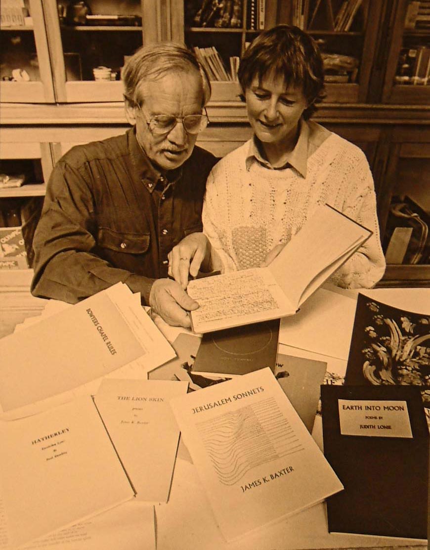 When Maslen returned to Otago from sabbatical in 1967, he was determined to put the operation of the Press on sounder ground. He drew up the ‘Chapel Rules’, which were given to each user for signing. He started a register that logged in users and visitors to the press, and in order to document the activities of the press, instigated the policy of taking two copies of every item printed. This was the beginning of the Bibliography Room Archive, now a collection filling ten boxes. No matter how skilled one was in the ‘Black Art’, there remains one golden rule: ‘type comes in fonts and lives in cases. It needs your help to go home.’ Two versions of the ‘Chapel Rules’ are on display alongside a photograph of authors Maurice Shadbolt and Elspeth Sandys (the 1996 Burns Fellow), seen admiring some of outputs from the Press. Maurice Shadbolt and Elspeth Sandys, 4 March 1996 |