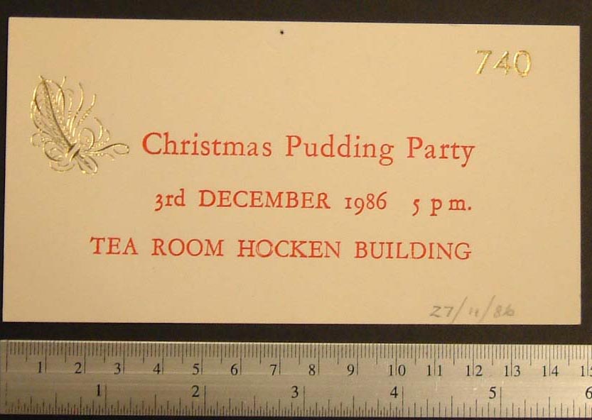 The Bibliography Room has been fortunate in its donors. The Albion hand press was begged from the Otago Museum. The Columbian hand press came from Laing and Matthews, and was probably brought to Dunedin in the mid-1860s by Henry Wise. John McIndoe gave samples of Bodoni and Plantin type, the Otago Daily Times gave founts of Garamond, and S. N. Brown supplied the type cases, now collectable as knick-knack holders. Others gave their time and expertise: Bryan Kershaw, Don Tobin, and members of the Otago Graphics Arts Club. This small poster was printed in 1967 in recognition of the generosity of these four Dunedin firms. Christmas Pudding Party, 3 December 1986 |