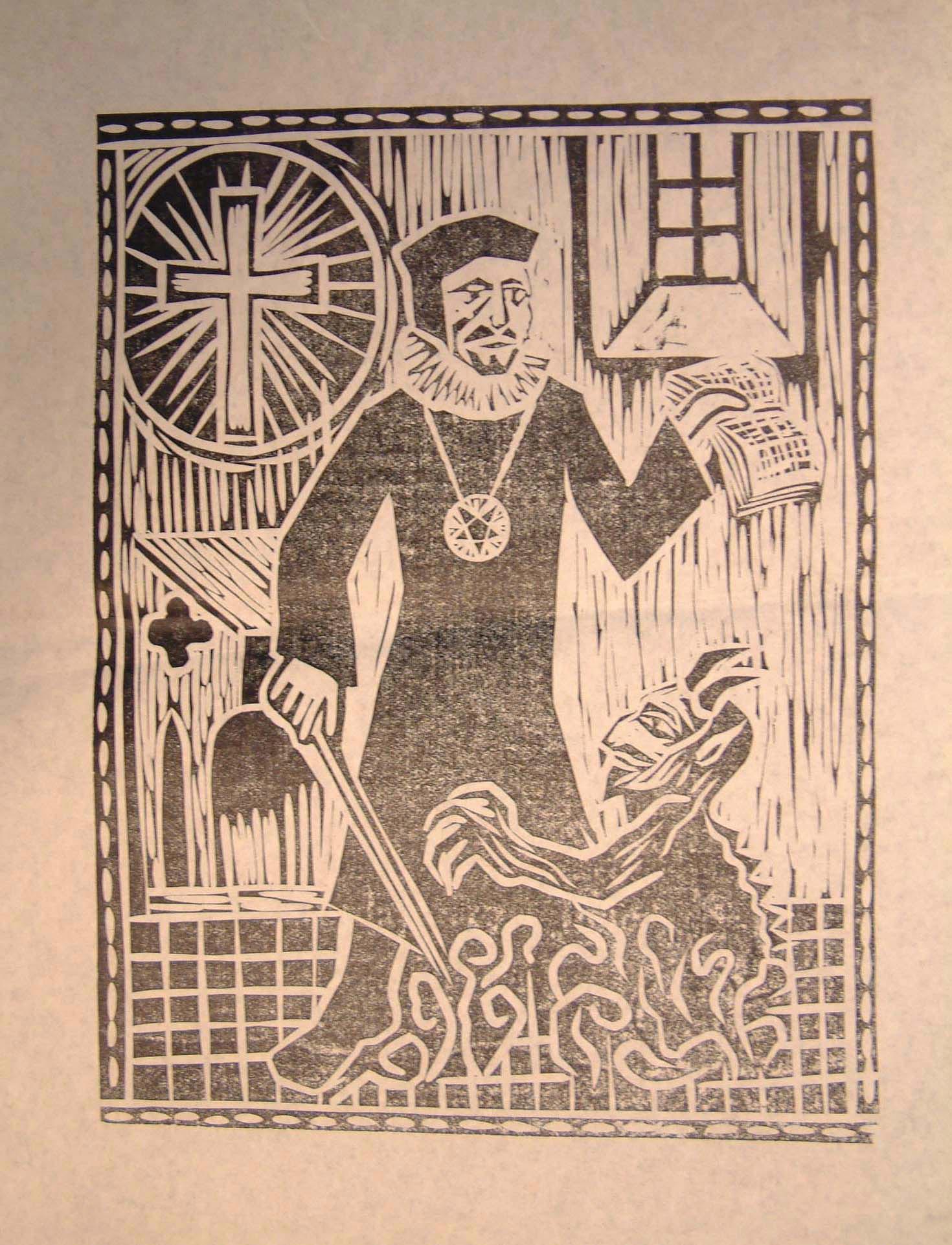 A rather plain poster for John Webster’s The Tragedy of the Duchesse of Malfy sits between two striking woodcut images. In 1964 Roger Collins and Robert Scoliège from the Modern Languages Department organised a performance of Jean Anouilh’s Antigone, based on Sophocles’ Greek tragedy, which was first performed in Athens in the 5th century BC. The Antigone woodcut (with block on display) was executed by John Brown. Pauline Carnegie created the Faustus image for the 1972 performance of Dr Faustus. The large flat bed of the Columbian Press is ideal for producing such large poster images. Woodcut for John Webster’s The Tragedy of the Duchesse of Malfy, 1966 |