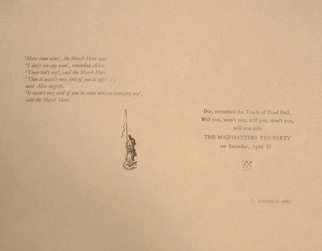 The following year, Maslen printed Ruth Dallas’s Ragamuffin Scarecrow. This was a collaborative production, with Hal Smith and Els Noordhof (the artist) proofing the blocks, Gary Porter (of Wickliffe Press) machine setting most of the Times Roman type, and printers from Laing and Matthews machining the edition sheets. The edition ran to 750 copies. After such activities, the ‘Mad-Hatters’ party in 1969 was no doubt welcome relief. The Mad Hatters Tea Party, 20 April, 1969 |