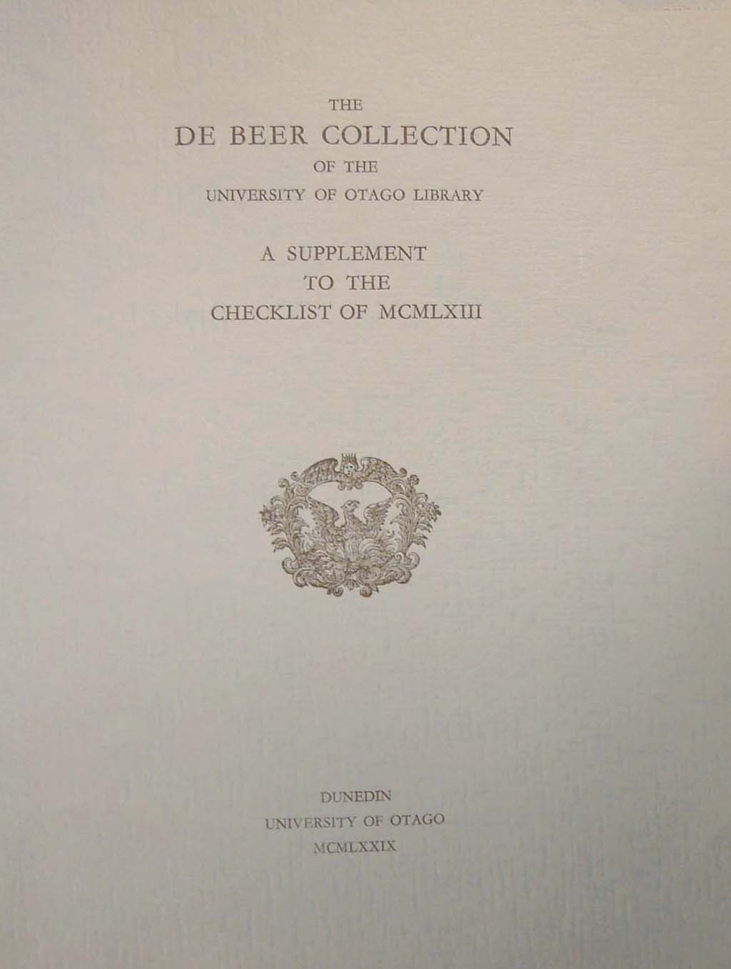 Over the years, a small number of University-wide publications were given hand-printed covers which, while not great samples of design, were certainly different. Various Proceedings of the Otago branch of the Library Association, L. B. D. Heenan’s work on internal migration in the South Island (1968), a Festival Handbook for the Students Association (1970), and the Robert Graves Collection at the Otago University Library (1972) received their standard blue textured covers. To the left of the cover to the supplement listing of Esmond de Beer’s rare book collection are sheets that show some of the printing processes: the outside frames and ornament placement followed by completed text announcing the programme for Lady Audley’s Secret (1964). Cover of A Supplement to the Checklist of 1963, the De Beer Collection of the University of Otago Library, 1979 |