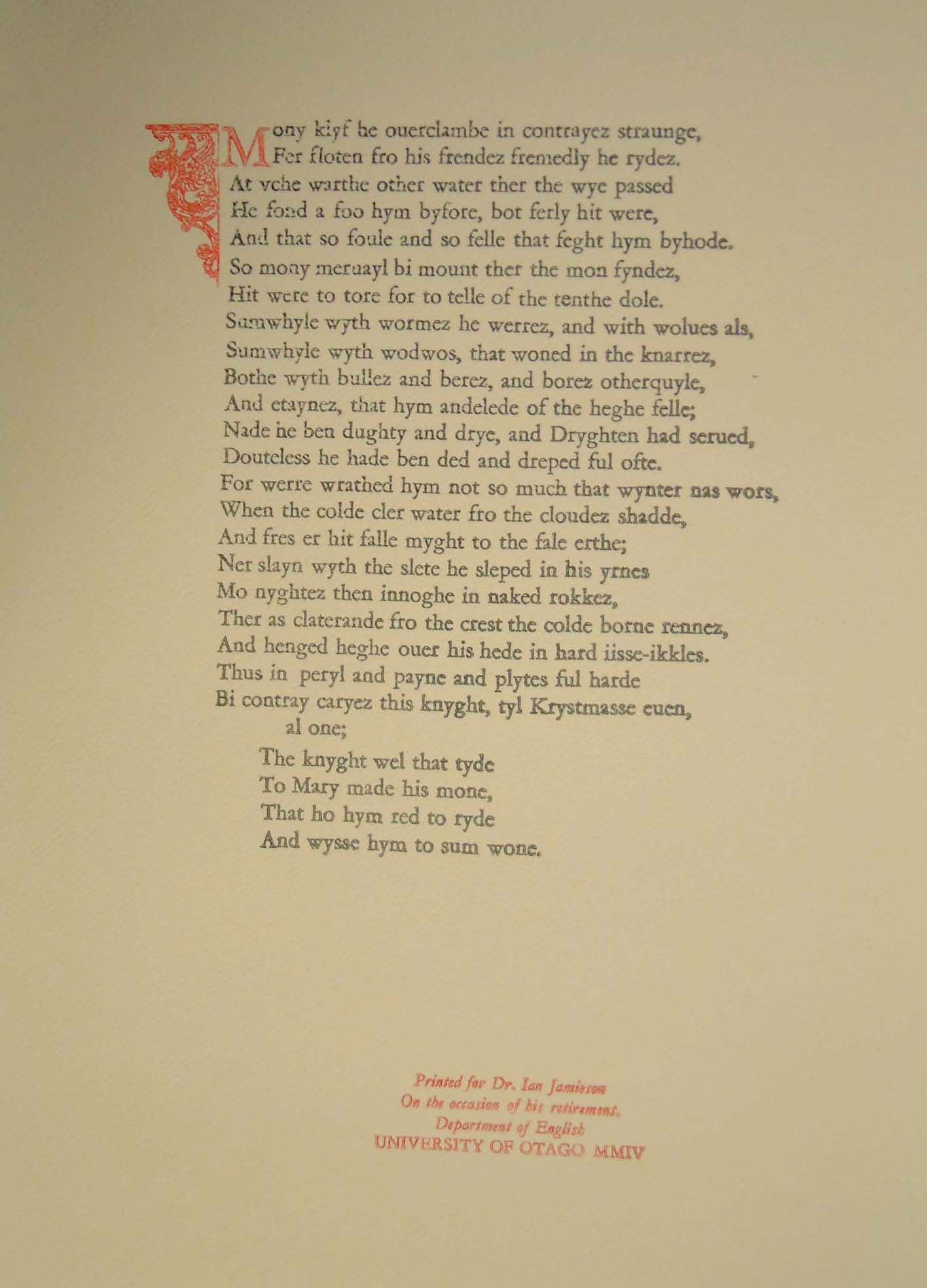 English students Shelley Gurney and Linda Lamb printed this extract from Sir Gawain and the Green Knight in late July 2004, on the occasion of Dr Ian Jamieson’s retirement from the English Department. He is now resident in Wellington. Extract from Sir Gawain and the Green Knight. Dunedin: Bibliography Room, 2004 |